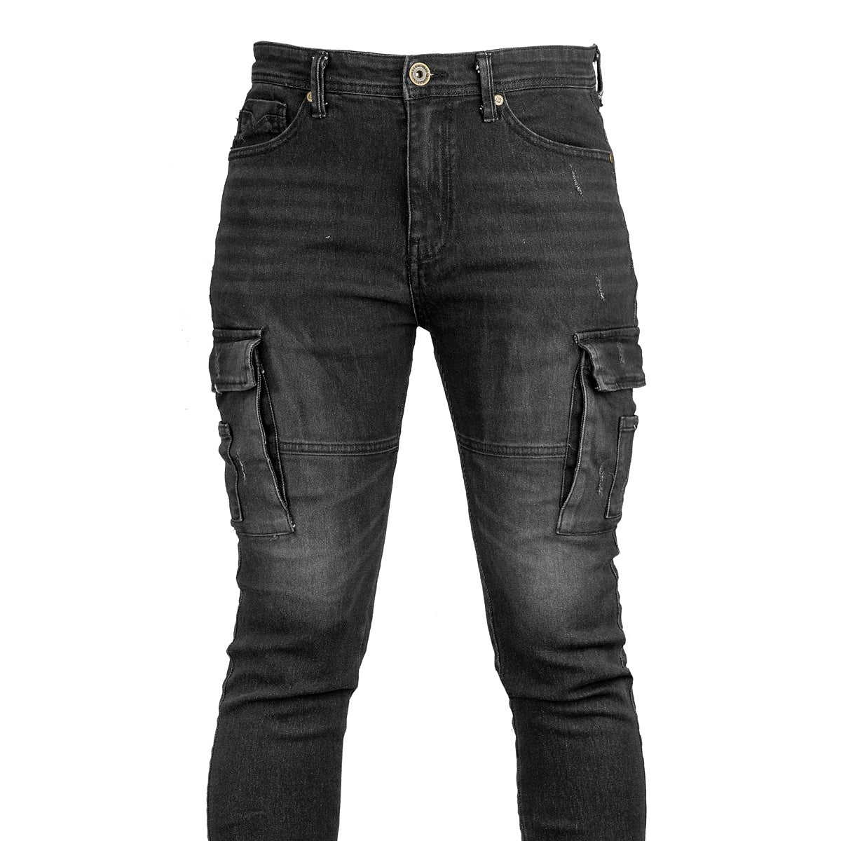 Czarne spodnie bojówki jeans z przetarciami. Wyposażone w dwie kieszenie z przodu, dwie z tyłu oraz dwie z boku na nogawkach zapinane na zatrzask. Materiał : 70% bawełna, 28% poliester, gramatura 360g/m2, rozmiary 44 - 62, karton zbiorczy : 20 sztuk. |